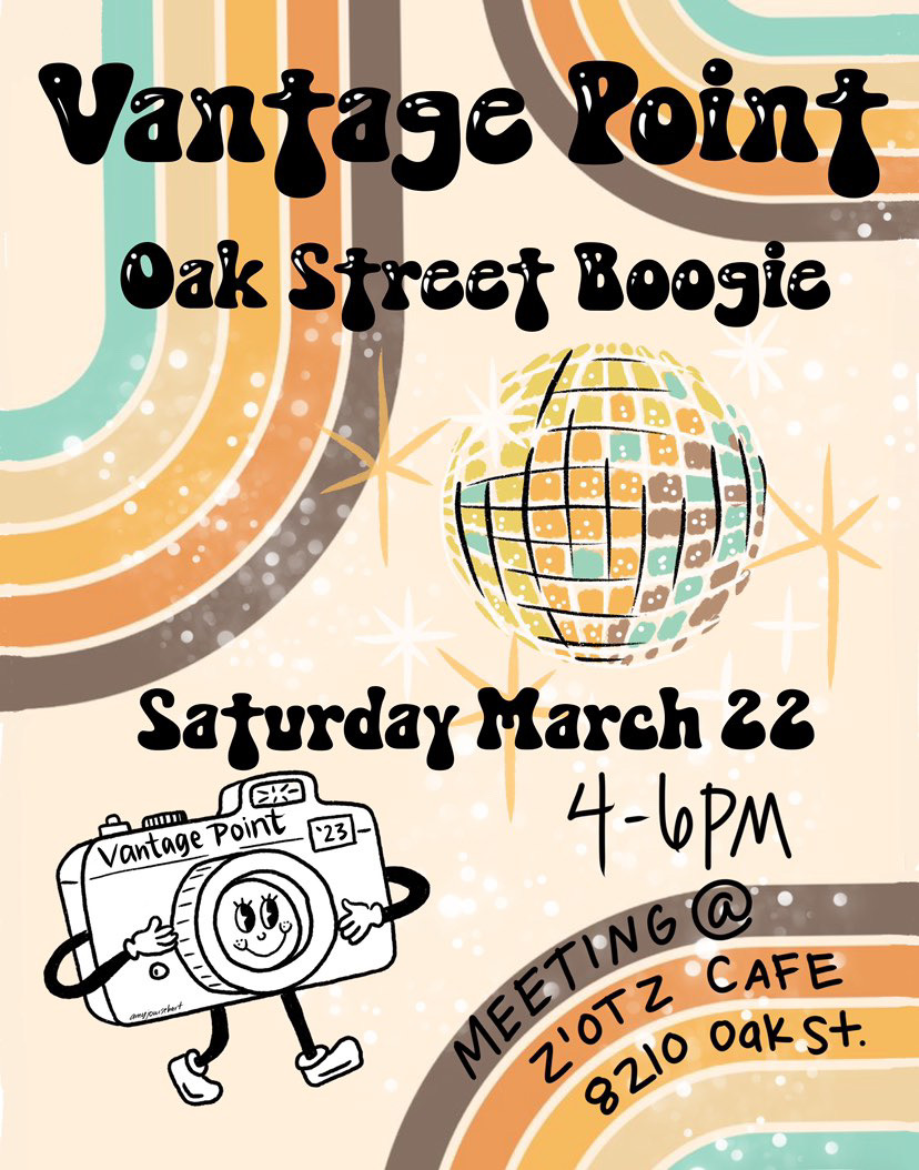 Our January Vantage Point Photo Walk will be held from 4-6pm on March 22 on Oak Street, with a Groovy 1970’s theme ! We’re meeting at Z’otz Coffee House…